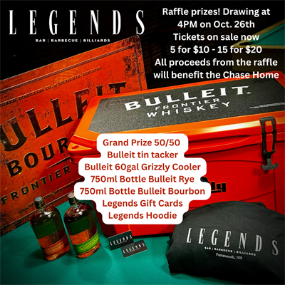$25 entry fee Drawing at 4PM on Oct. 26th Tickets on sale now 5 for $10 - 15 for $20 All proceeds from the raffle will benefit the Chase Home Grand Prize 50/50 Bulleit tin tacker Bulleit 60gal Grizzly Cooler 750ml Bottle Bulleit Rye 750ml Bottle Bulleit Bourbon Legends Gift Cards Legends Hoodie